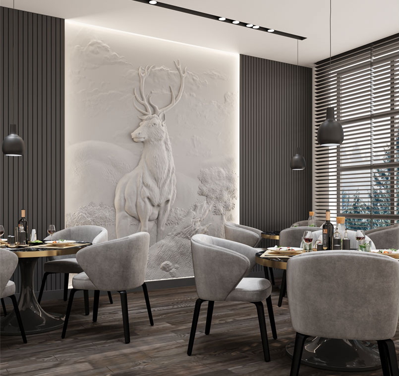 Interior Design: Kitchen – Counters – Tables – Wall Cladding – Living room – LCD Unit – Fireplace – Wall Frame – toilets – Entrance – Reception.